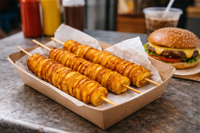 Zakręcony ziemniak coraz częściej pojawia się w kartach stałych lokali gastronomicznych – nie jako dodatek, ale jako samodzielna przekąska lub element zestawu. Podany w ozdobnym opakowaniu, posypany serem parmezanem i polany aromatycznym sosem truflowym, może być propozycją dla klientów szukających czegoś oryginalnego. Szczególnie dobrze pasuje do lokali o casualowym charakterze – burgerowni, piwiarni, lokali z jedzeniem „z grilla", bistro serwujących kuchnię uliczną w bardziej komfortowych warunkach.
